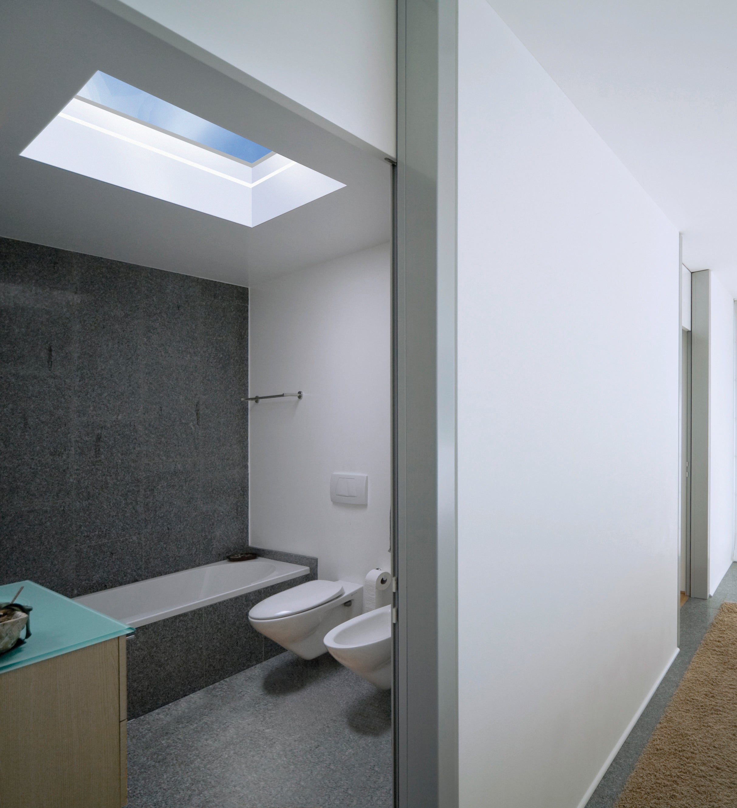 The Brett Martin Flat Glass manual hinged rooflight with a splayed PVC kerb. Beautifully designed contemporary double glazed laminated glass rooflight combines minimal framework with the benefit of being able to open for ventilation.