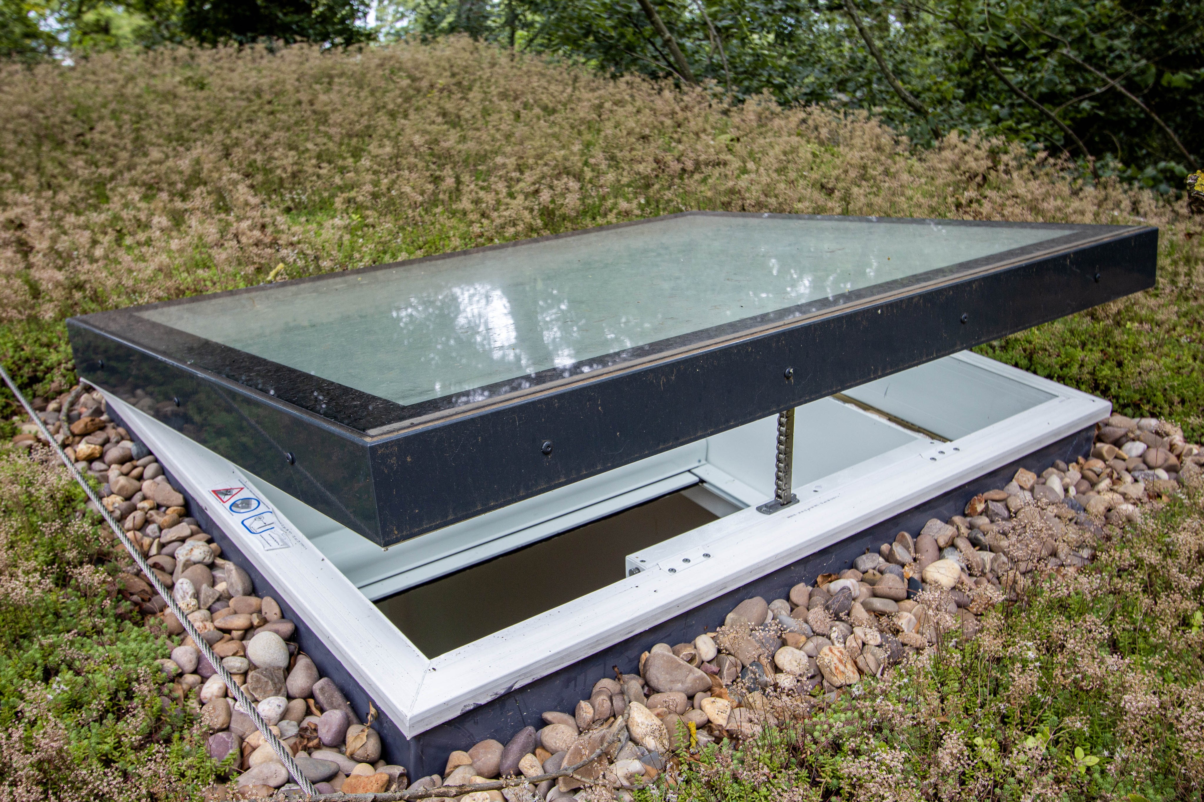 Lunaglaze flat topped glass rooflight with electrically hinged ventilation to suit a builders timber kerb