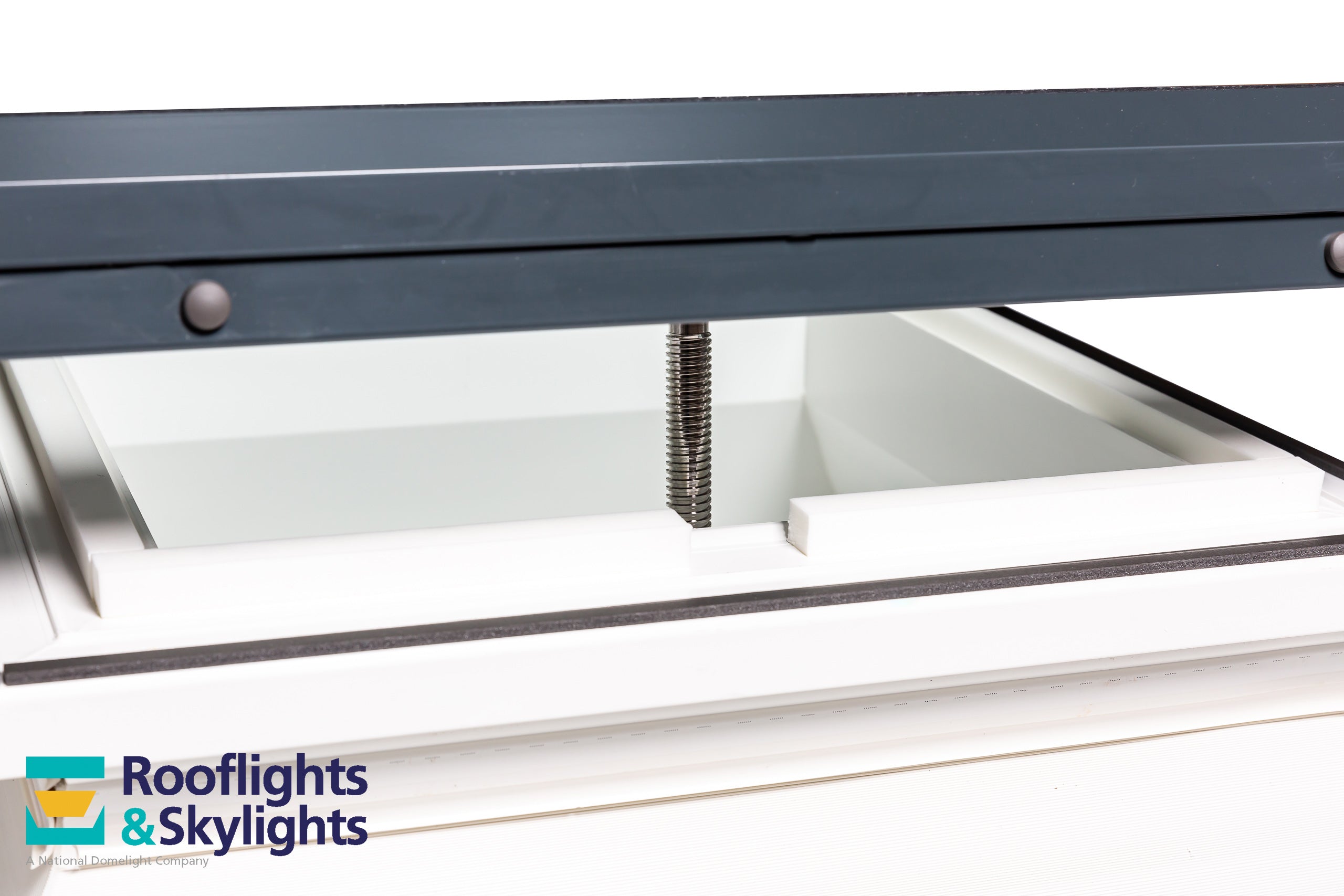 R&S Glass Manual Hinge Rooflight with 150mm high splayed white PVC kerb. Designed to fit directly to the roof deck, this rooflight looks beautiful whilst also being affordable.